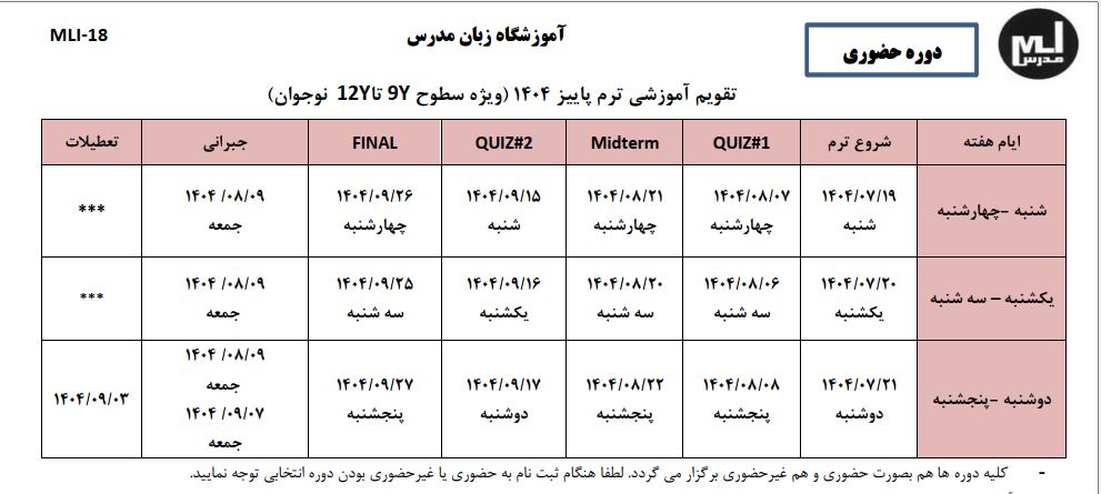 تقویم آموزشی ترم پاییز 1404 (ویژه سطوح Y9 تاY12 نوجوان)